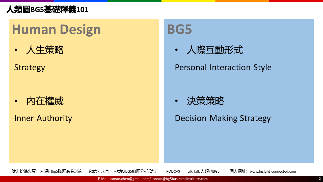 不過,其中還是有一點點的不同,我們將人類圖的“策略”(人生策略),用更務實的說法“人際互動形式”來替代。或許這是我們BG5的核心出發點的本質不同。BG5的核心出發點是與人進行溝通,如何透過與人進行有效的溝通,進而能夠在商業環境當中,透過能量資源的交換來獲取利益。而人類圖一開始則是認識自己、瞭解自己、愛自己。沒有對錯,我覺得都很好,就只是一個出發點的差異。