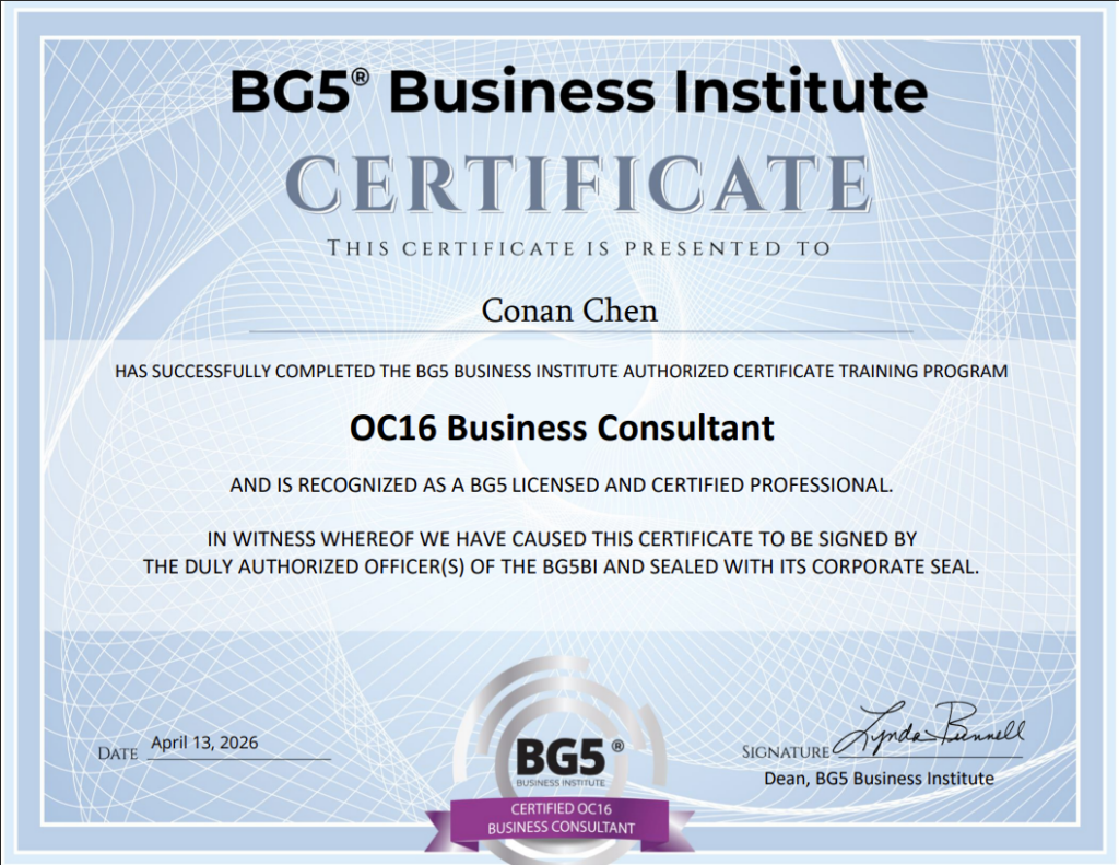 Finally,拿到了 BG5 Business Institute 正式頒發的 OC16 認證顧問資格。
